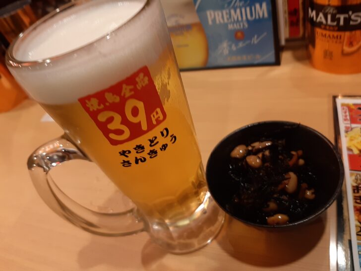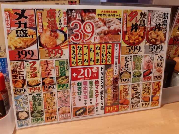 焼鳥は1本【税抜39円】で、7種類あり、タレと塩が選べます。また、プラス【税抜20円】でトッピング変わり串にできるようです。他のつまみも【税抜199円】が多いので、安くて嬉しいですね。他のつまみは【税抜299円】、【税抜399円】とこちらも安いですね。御飯もの焼鳥塩丼・タレ丼【税抜599円】一番高いメニューですね。