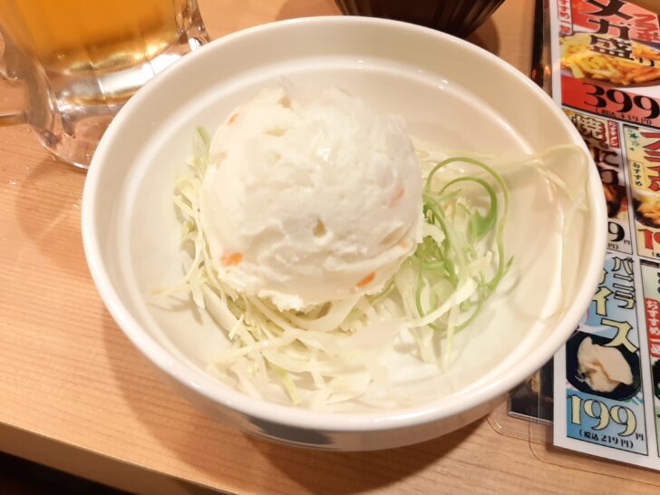 1品目はポテサラ【税抜199円】を注文。これは普通に美味しいですね。
