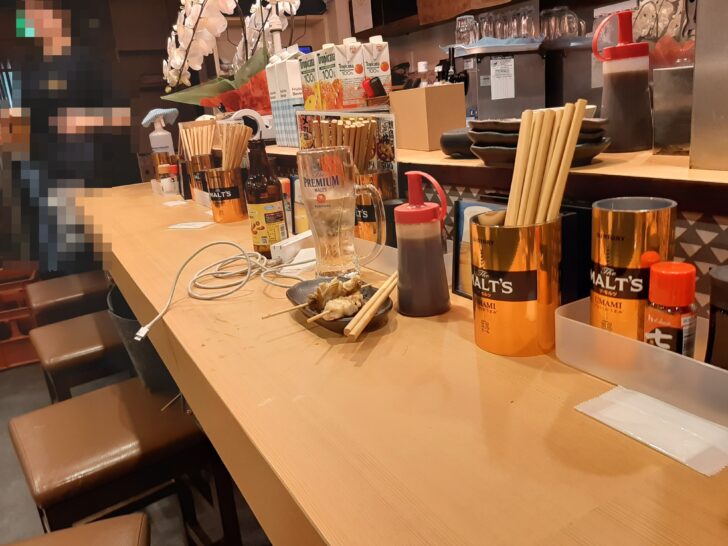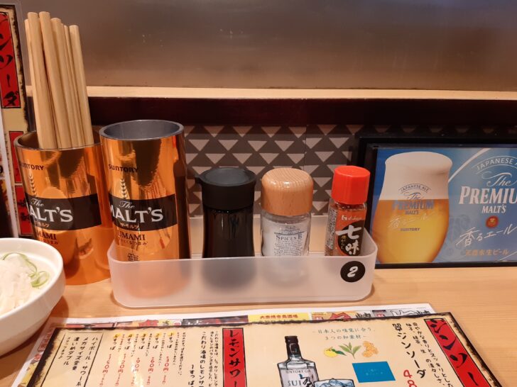 卓上調味料は、醤油、塩、七味ですね。後は、箸と串立てが設置されていました。