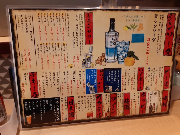 おつまみが安いので、ドリンクはやはり高めですね。生ビール・ジンソーダ・レモンサワー・ハイボール【税抜480円】、その中でも安いのは、酎ハイ【税抜339円】、ウーロンハイ等【税抜380円】ですね。