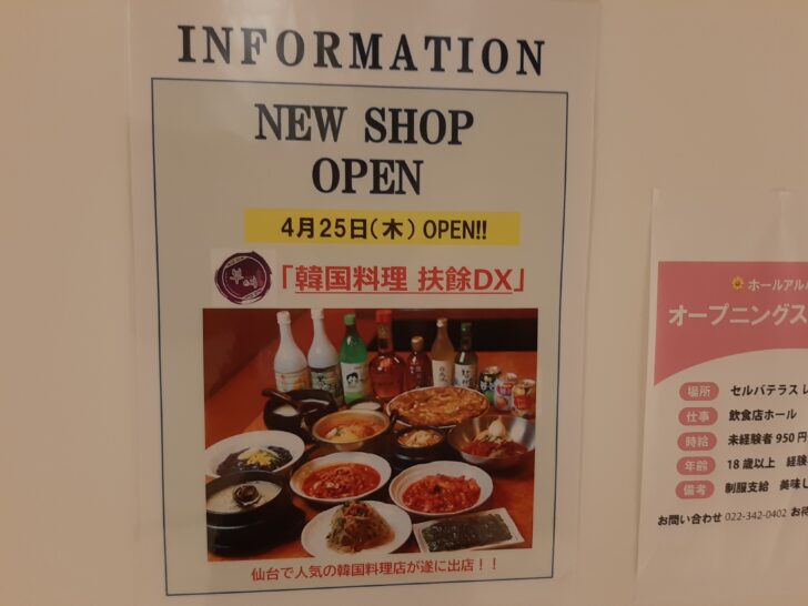 セルバテラスに韓国料理『 扶餘DX(プヨデラックス)セルバテラス店 』が4/25オープンしますが、泉中央にランチやちょい呑みができるお店が増えるのは嬉しいですね。どんな特徴があるお店になるのか楽しみですね。オープンしたら早速行ってみたいと思います。