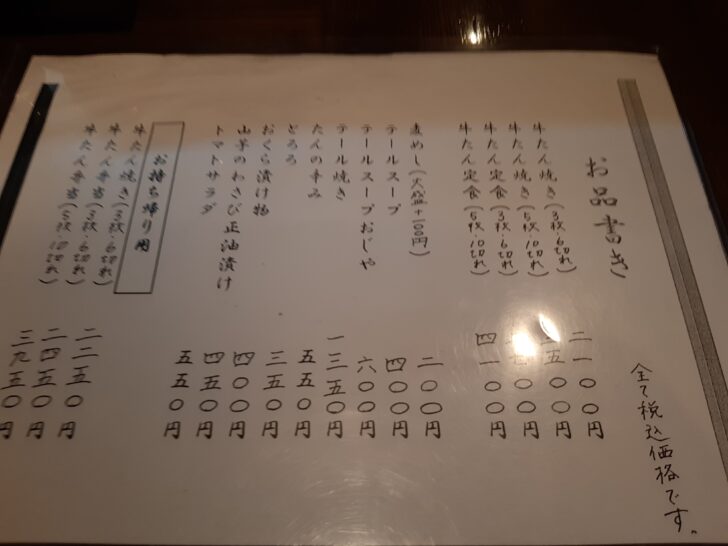 「牛たん定食(3枚6切れ)」は【税込2,700円】、「牛たん定食(5枚10切れ)」は【税込4,100円】です。珍しいメニューとしては「たんの辛み味」というのもありました。