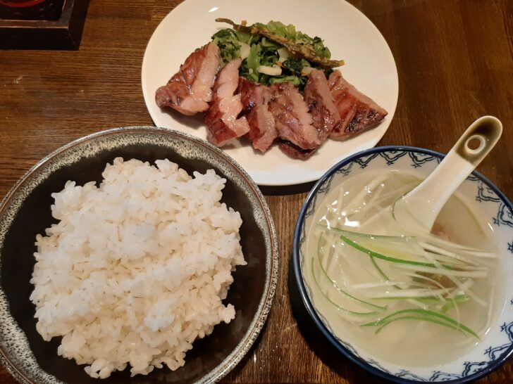 今回はサービスランチ定食をいただこうと思って訪問したのですが、現在は提供していないようなので、「牛たん定食(3枚6切れ)」【税込\2,700】を注文しました。テールスープ、麦めしがついています。