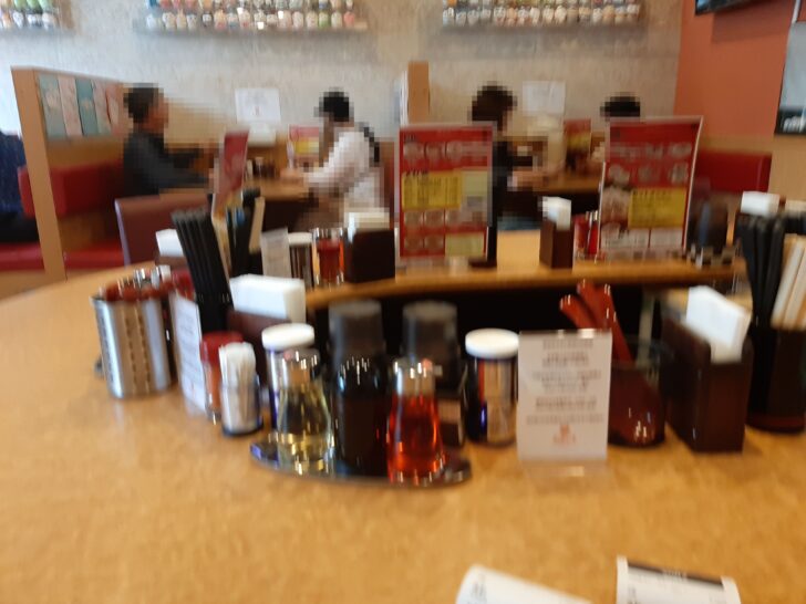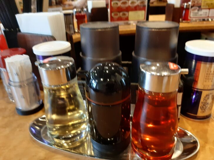 卓上調味料は、胡椒、酢、醤油、ラー油でした。