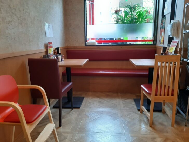 『らーめん中華 わかいち』の店内は、以前の「ラーメン天狗山大和町店」のままでしたね。お店の真ん中あたりにU字型のカウンターが6席あり、両端に4人掛×3卓、2人掛×2のテーブル席がありました。なので席数は全部で22席ありました。