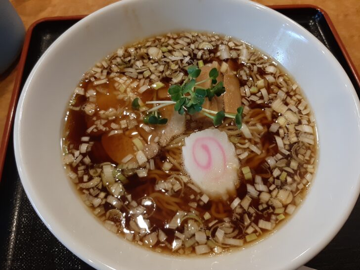 何にするか迷ったのですが、とりあえず醤油らーめんにしました。オープニングイベントで麺類は税込700円で提供されていました。良く考えたら、もっと高いメニューにした方が良かったと後悔しました。