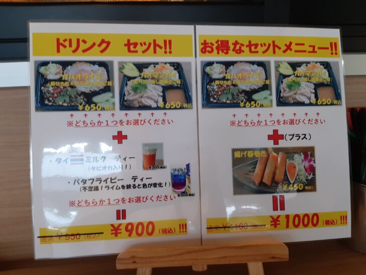 現在のメニューのメインは「ガパオライス」「カオマンガイ」の2種類のみ【税込\650】です。これにセットメニューが2種類あって、ドリンクセット【税込¥900】、揚げ春巻きのセット【税込\1,000】になります。また揚げ春巻き単品は【税込\450】となるようです。
