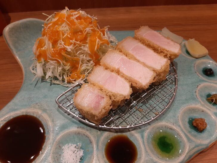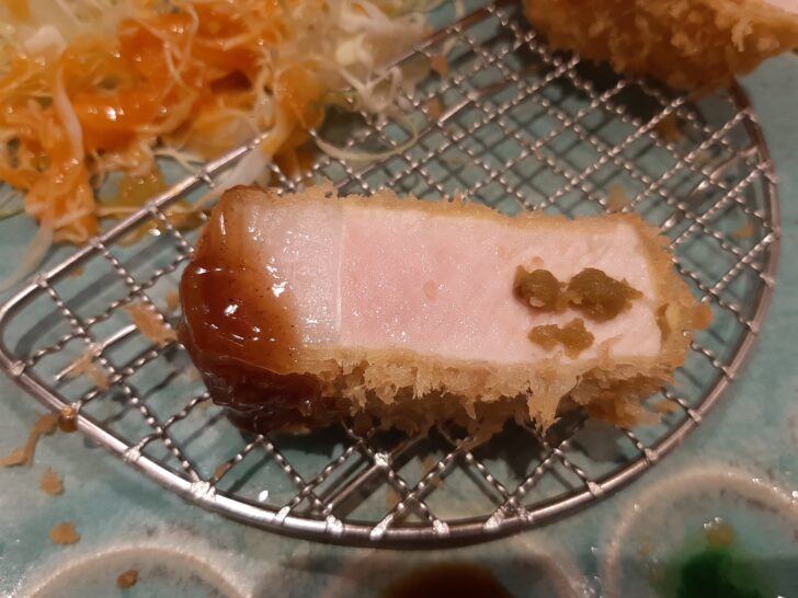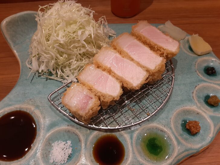 料理の提供時に店員さんがとんかつ用皿に添付された調味料の説明を丁寧にしてくれましたが、多すぎてなかなか覚えられないですね。正確ではないかも知れません、一番右上から漬物(べったら漬け)、レモン、粒胡椒、柚子胡椒、あけがらし、オリーブオイル、醤油、岩塩、いちぢくソースになっていました。