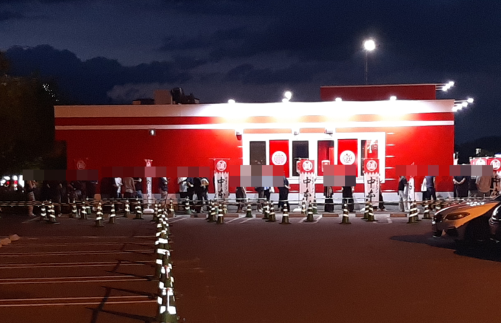 中毒者続出の辛旨ラーメンで大人気の「蒙古タンメン中本」の29店舗目となる「蒙古タンメン中本 仙台富谷店」がイオンモール富谷店の外部棟に2024年8月5日にオープンしました。オープン時には、大行列が出来て、着丼まで、4時間とか6時間とか、とんでもない待ち時間が掛かっているようです。暑い中で長時間並ぶのは、熱中症になる可能性もあるので、避けて夜営業時に行くことにしました。そこで、休日になると混むと思われたので、オープン4日目8/8(木)の夜19:00頃に行ったのですが、まさかの店外には70人程の大行列ができていました。これでは、2時間待ちは確実なので、残念ですが今回は断念しました。もう少し経過してから再訪問したいと思います。