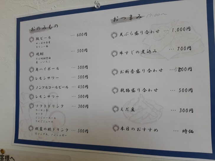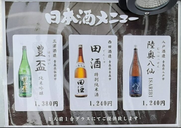 日本酒メニューでは、豊盃、田酒、陸奥八仙と青森県の人気酒が揃っているようです。