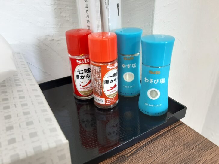 卓上調味料は、一味唐からし、七味唐からし、わさび塩、ゆず塩がありました。