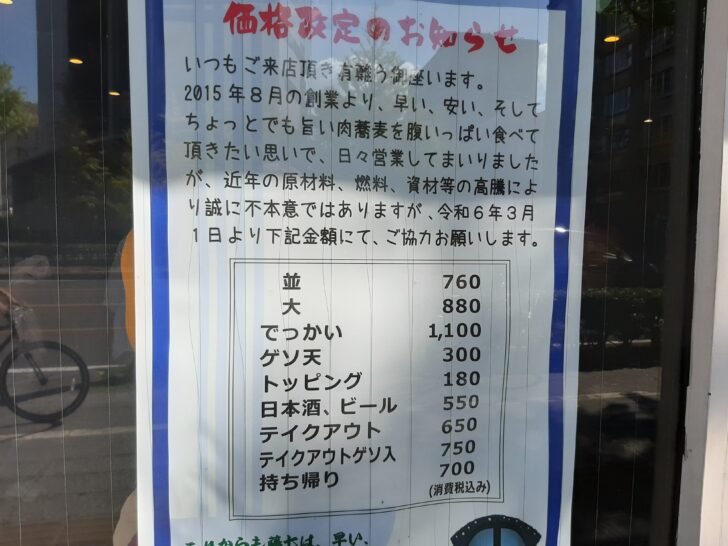『肉そば藤七 上杉本店』の肉そばは、原材料、燃料、資材等の高騰により2024年3月より価格改定となりました。メニューは肉そば・鳥中華・つけそばの3種類のみです。サイズがそれぞれ(並)760円・(大)880円・(でっかい)1,100円で、どれかを選択します。これに「トッピングげそ天180円」、「皿盛りげそ天300円」を追加できます。他には「日本酒、ビール550円」、「テイクアウト650円」、「テイクアウトゲソ入750円」、「持ち帰り700円」です。