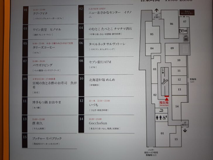 『ニューおさかなセンター イチノニ』の場所は、下記のレイアウト図の【02】の所ですね。1F朝市口に近いです。また、仙台駅直結の2Fからエレベータを降りるとすぐ正面にあります。