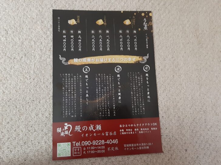 『鰻の成瀬 イオンモール富谷店』のメニュー