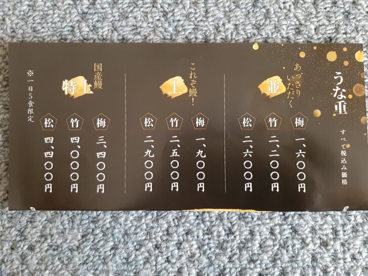 うな重のメニューは次の通り【並】【上】【特上】の3種類で鰻の量によって『(梅)』『(竹)』『(松)』を選択できるようになっています。