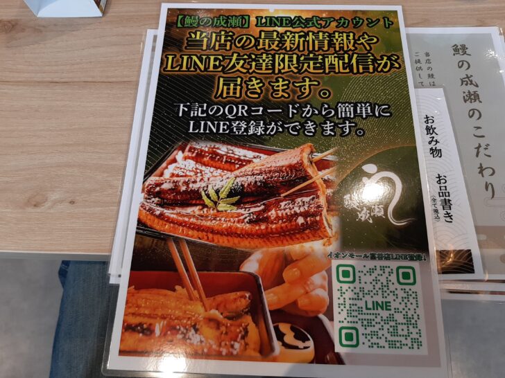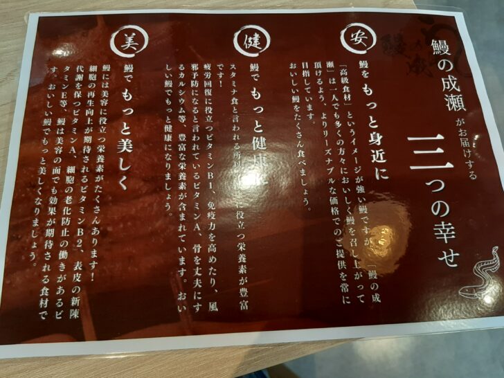 鰻の成瀬のこだわりを記載した物も置いてありました。