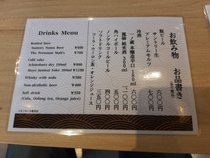 お飲み物のメニューには、瓶ビール、日本酒(冷酒)、ハイボール、ノンアルビール、ソフトドリンク等があります。