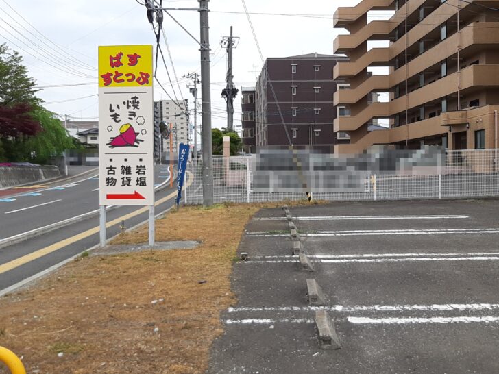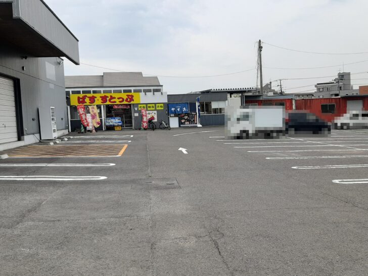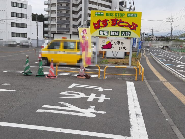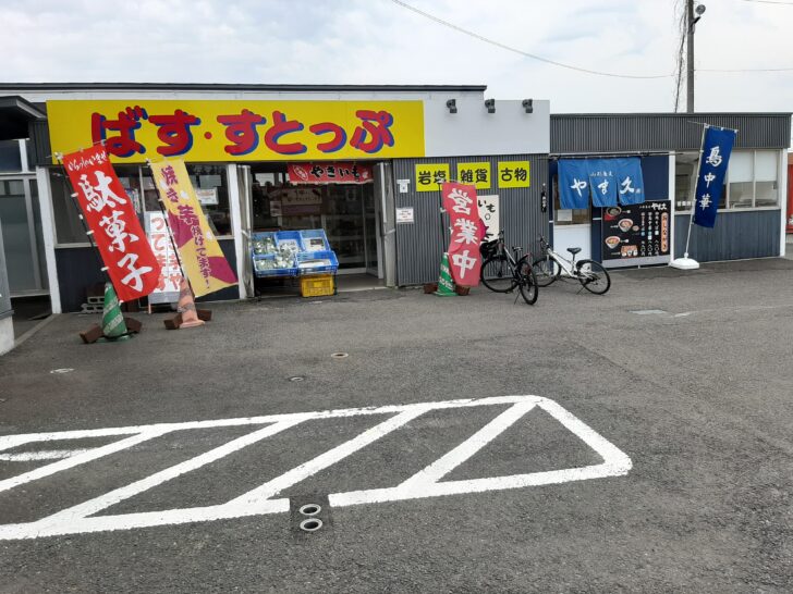 『やま久 泉中央分店』の場所は、焼きいも、岩塩、雑貨、古物のお店「ばすすとっぷ」と同じ建物内にあります。泉中央駅の仙台銀行ホールイズミティ21の交差点を西に約600m進むとばすすとっぷの看板が見えてきます。また、営業時間中は、肉そば、鳥中華ののぼり目印ですね。