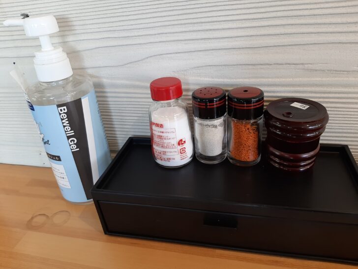 卓上調味料は、一味唐辛子、七味唐辛子、こしょう、食塩ですね。