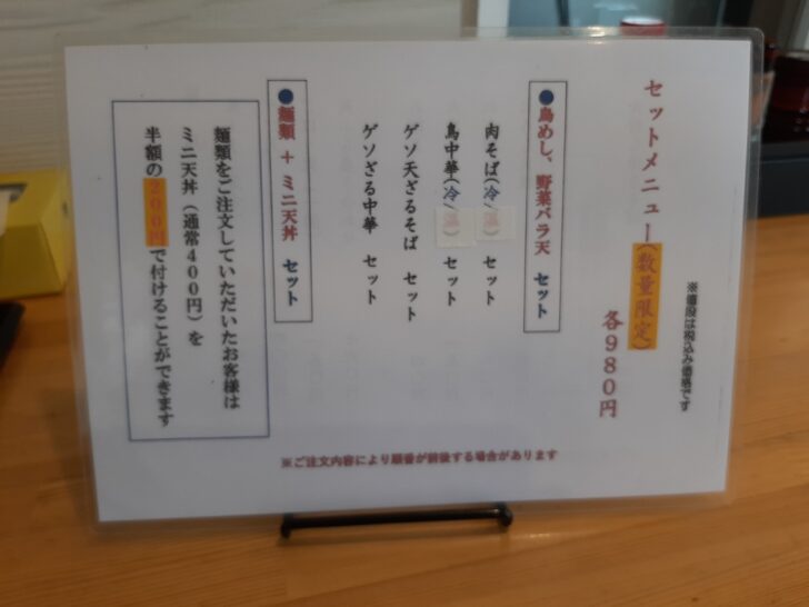 今回は、とってもお得で美味しい1,000円セットを注文しました。セットの内容は、好きな麺類(肉そば、鳥中華)を選択、これにご飯物(ミニ天丼又は鶏めし)選択、これにもつ煮、バラ天、漬物(辛子高菜)が付いていて、ボリューム満点です。これで1,000円はコスパ最高ですね。