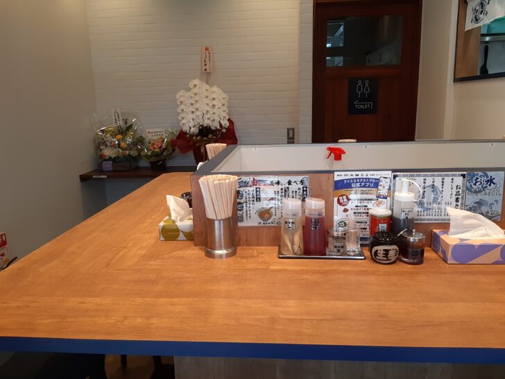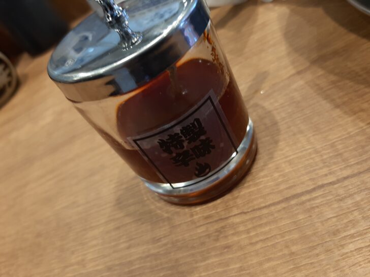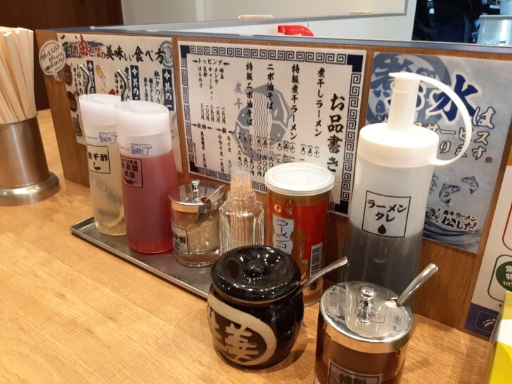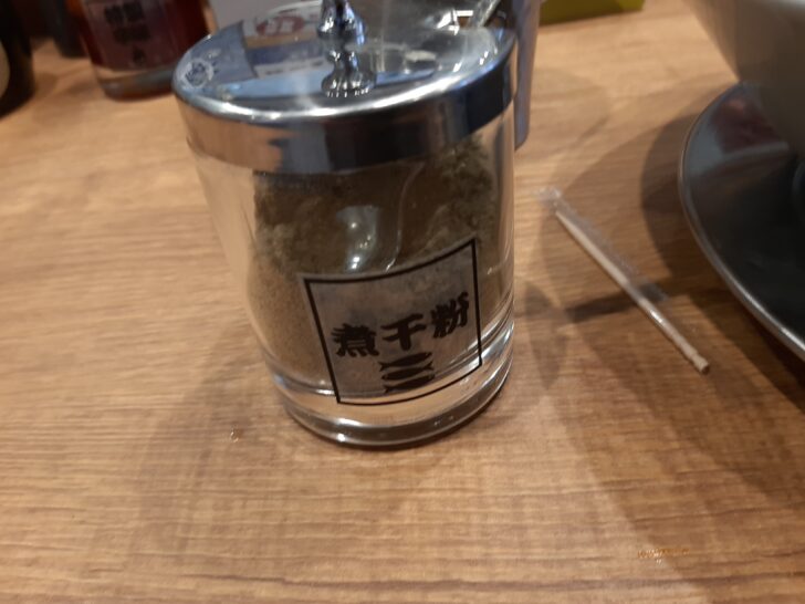 卓上調味料は、煮干酢、自家製辣油、煮干子粉、ラーメンコショウ、刻み生姜、ラーメンタレ、特製辛味がありました。