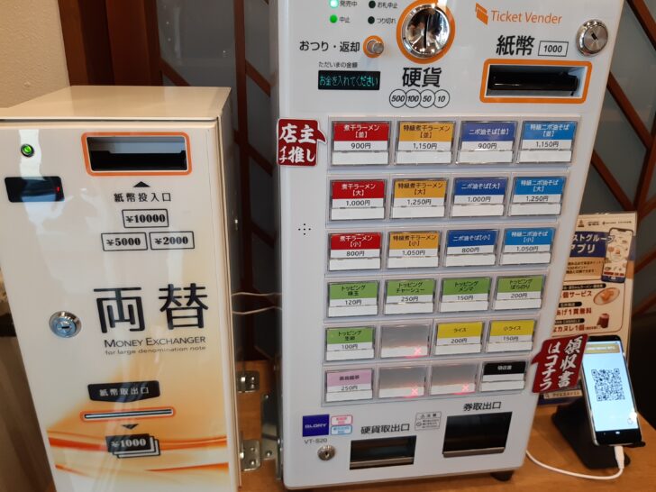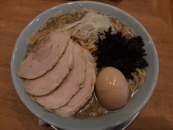 今回は、特級煮干しラーメン(並)【税込1,150円】を注文しました。特級というのは、追加のトッピングが載ったものとのことで、煮玉子、チャーシューが追加されています。それから、食券を購入して、店員さんに渡す時に、麺の硬さを聞かれます。硬め、普通、柔らかめがあるとのことでしたが、今回は普通をリクエスト(最初硬めをリクエストした所、店員さんが、極太麺なので、硬めだと噛みにくいですよと言われたので変更)。
