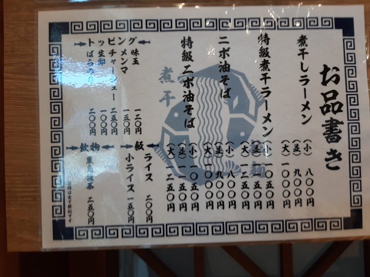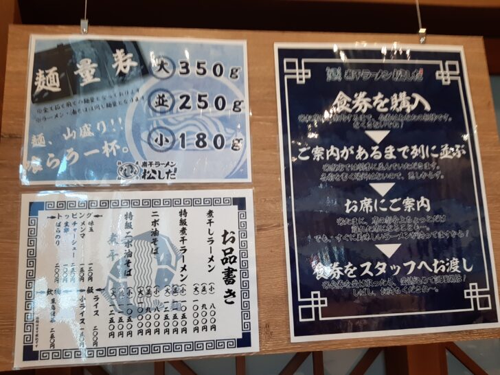 『煮干ラーメン松した』のメニューについては、開店前には情報が全く開示されていませんでしたが、メニューは次の通りで、煮干しラーメン、特級煮干しラーメンとニボ油そば、特級ニボ油そばの4種類です。それから麺量は(小)(並)(大)の3種類があります。後は、単品のトッピングとライスとドリンクとシンプルなメニューですね。