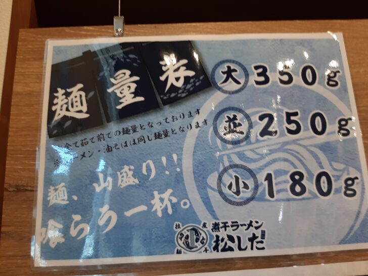 麺量は(小)180g、(並)250g、(大)350gとなっていますが、茹でる前の麺量とのことです。茹でると1.3~1.5倍に膨らむので、実際の麺量は(並)でも325g~375g位になっていると思われます。