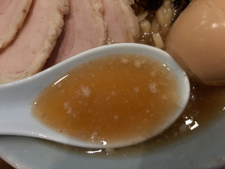 スープを一口。旨いと思わず唸ってしまう美味しさです。スープには、煮干だけでなく動物系も入っているようです。また、背脂もたくさん入っていました。