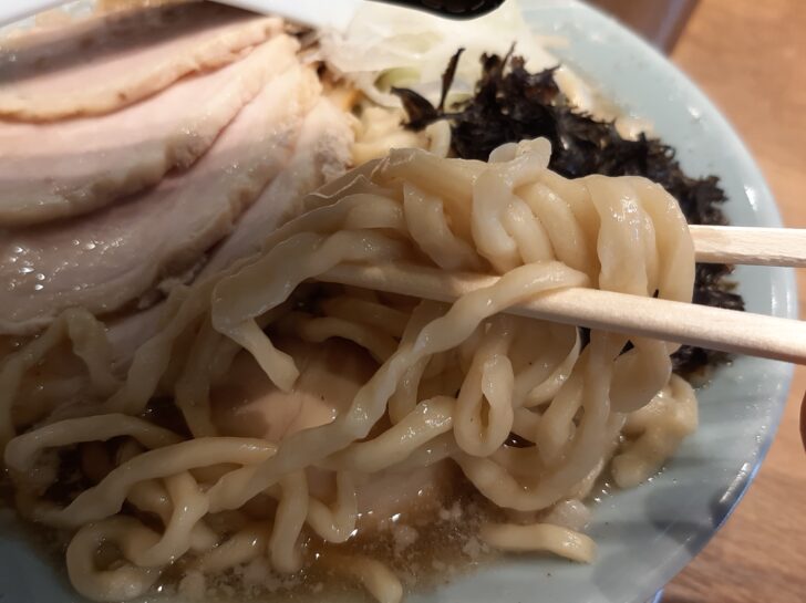 極太の麺は噛み応えがあり、もちもちしていて、スープにも良く絡みますね。私の好きなタイプの麺ですね。しかし(並)でも麺量は多いですね。350g位はありそうですね。
