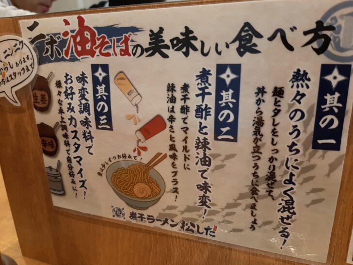 【ニボ油そばの美味しい食べ方】がカウンター席に貼ってありました。色々と味変ができるようですね。