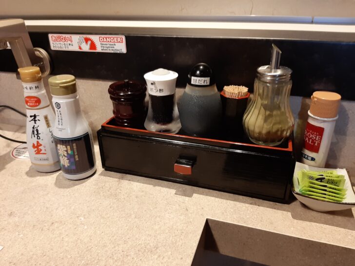卓上調味料は、醤油2種類、唐辛子、ポン酢、甘だれ、塩、わさびでした。