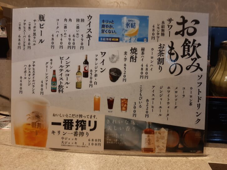 お飲みものメニューは、生ビール、瓶ビール、ウィスキー、サワー、焼酎、ワインと一通り揃っています。