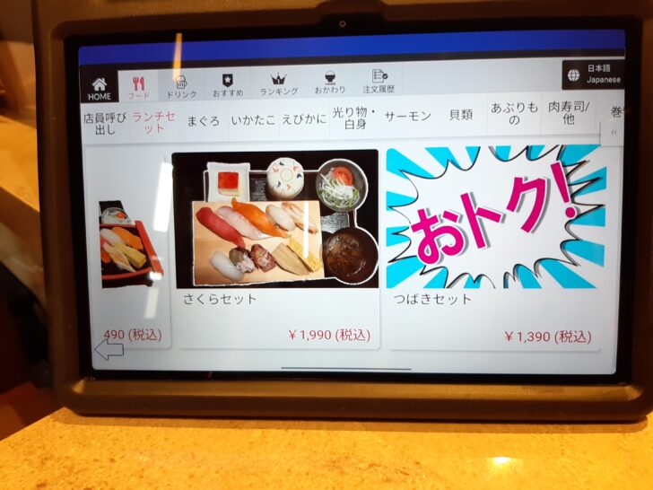 今回はかみさんと行きましたが、平日限定のランチセットを注文しました。かみさんは、松花堂ランチ【税込1,890円】、私はさくらセット【税込1,990円】を注文しました。注文はタブレットから行います。