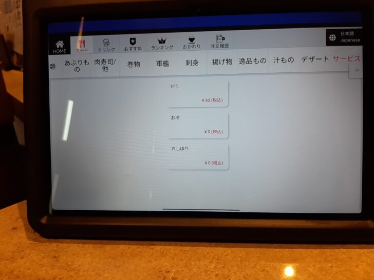 海鮮すし『源洋丸 仙台泉店』では、がりが有料(税込30円)と聞いていたので、注文しましたが、ランチセットには付いていることが分かったので、キャンセルしました。