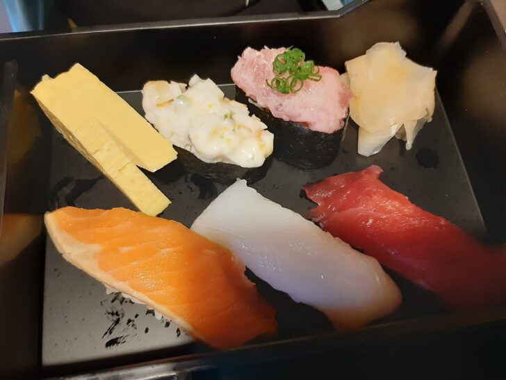 お寿司は、サーモン、いか、鮪、玉子、貝軍艦、ねぎとろ軍艦の6貫でした。『源洋丸 仙台泉店』では、ガリが有料(30円)と聞いていましたが、セットメニューには付いていました。