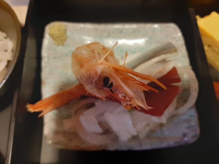 お刺身盛合わせは、鮪2切れ、こはだ2切れ、赤海老?でした。