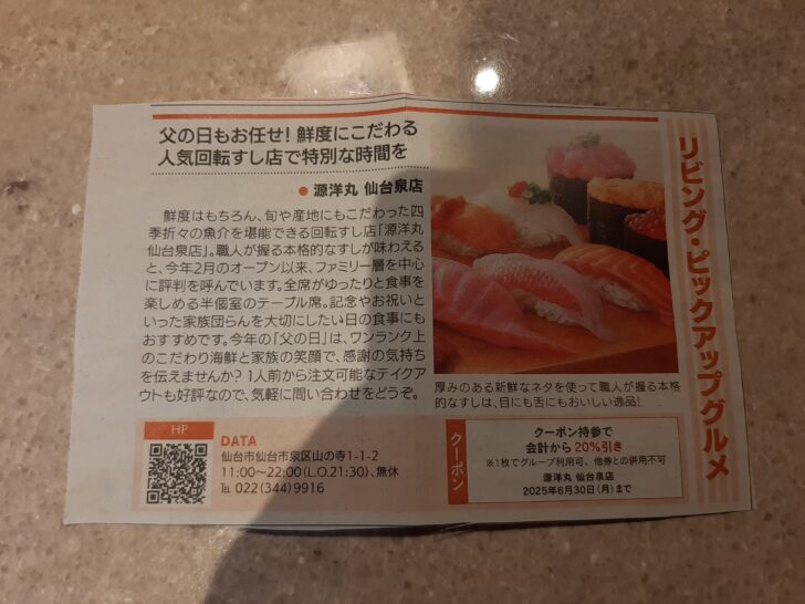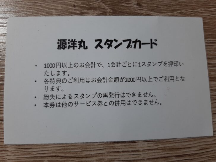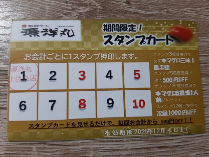 期間限定?かも知れませんが、『源洋丸 仙台泉店』では、スタンプカードもあります。スタンプカードを見せるだけで、毎回お会計から100円OFFとなります。また、スタンプ3個で、次回本マグロ三昧1皿半額、スタンプ5個で、次回500円OFF、スタンプ8個で、次回本マグロ6貫盛りプレゼント、スタンプ10個で、次回1000円OFFとなるようです。