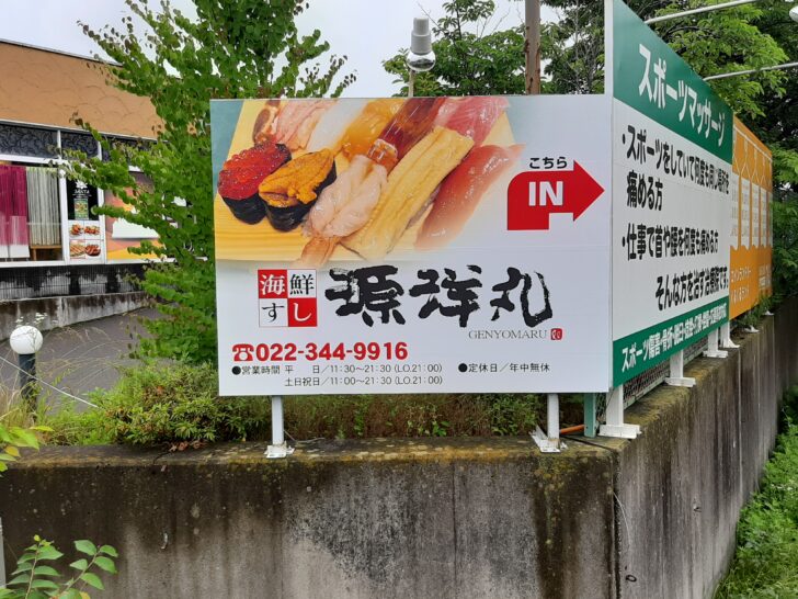 海鮮すし『源洋丸 仙台泉店』は、国道4号線沿いで鳥井原交差点近くの「吉野家4号線仙台山の寺店」の隣にありますね。4号バイパスよりは、ちょっと見えにくいかも知れません。