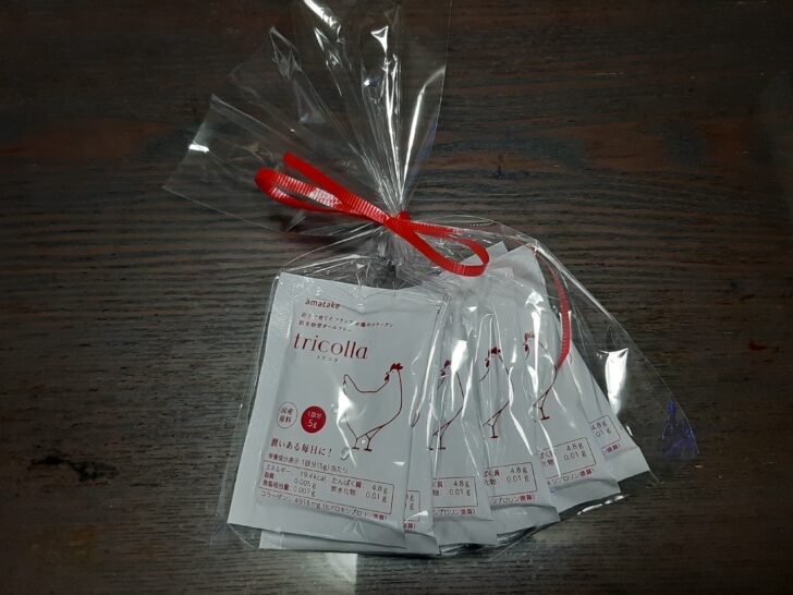 トリコラ<コラーゲンパウダー>は、抗生物質や合成抗菌剤を使用せずに、岩手で育てたフランス赤鶏からのみ抽出した鶏コラーゲンのようですが、お土産用に購入しました。なので、効果があるのかは分かりません。