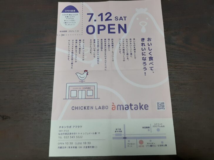 抗生物質オールフリーで育てたカラダに良い鶏で有名なアマタケが、おすすめ商品を取り揃えたセレクトショップ『チキンラボ アマタケ 泉中央店』を、仙台市泉区泉中央駅近くに2025年7月12日にオープンしました。早速行ってきたので紹介します。