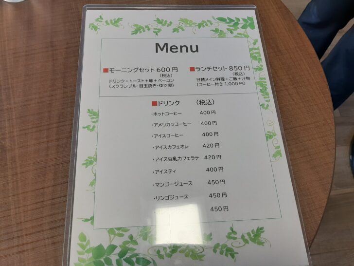 これがプレオープン中の現在のメニュー表です。モーニングセットは【税込600円】で、ドリンク、トースト、ベーコン、卵付きです。ランチセットは【税込850円】、ドリンク付きは【税込1,000円】です。