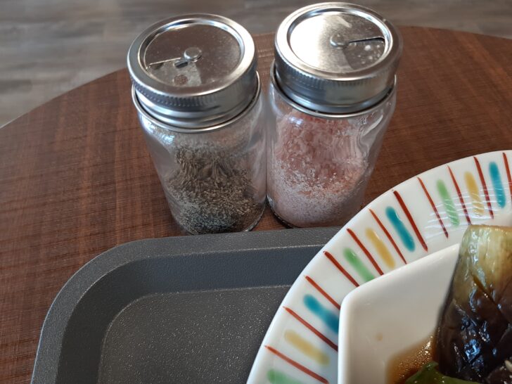 赤魚塩焼きの塩加減が足りないようであれば、掛けて下さいと、岩塩とコショウが付いてきました。