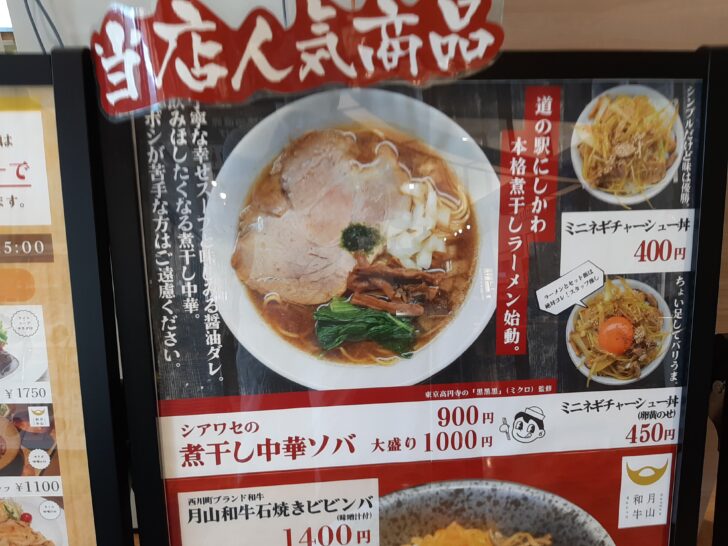 これが大人気のシアワセの「煮干し中華ソバ」ですね。(並盛)【税込900円】、(大盛り)【税込1,000円】です。この煮干し中華そばは、販売部門をプロデュースしていただいている、どりーむずかむとぅるーが運営している東京高円寺の「二階麺肴酒店 黒黒黒(ミクロ)」監修の元、道の駅で本格煮干しラーメンが実現したようです。一緒に食べたい御飯物としては、ミニネギチャーシュー丼【税込400円】、ミニネギチャーシュー丼(卵黄のせ)【税込450円】もありました。
