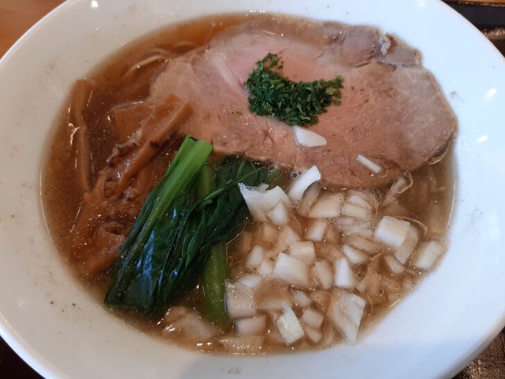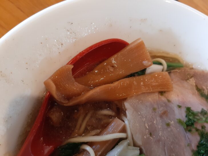 具材は、大きいチャーシュー、刻み玉ねぎ、ホウレン草、メンマ、青のりでした。情報によるとスープや具材も全て自家製とのことです。