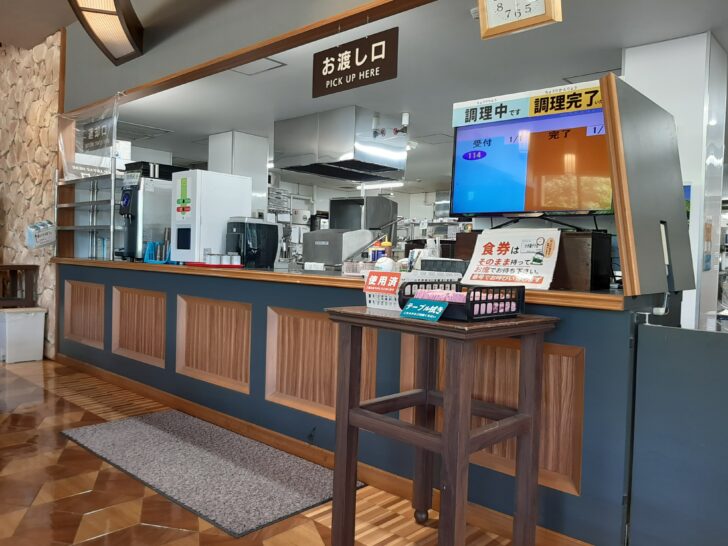 こちらが料理のお渡し口になりますが、調理中・調理完了の番号が表示されるようになっています。また、調理完了したら番号が呼ばれます。