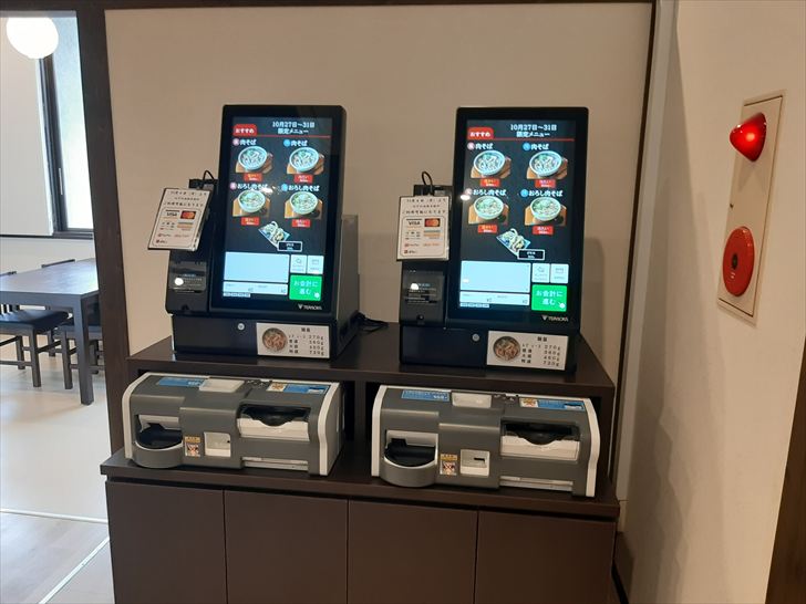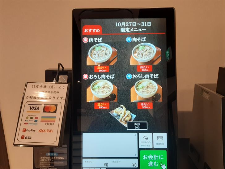 券売機はタッチパネル式の物ですね。訪問したのは、10/31だったので、提供メニューが限定されていました。また、クレジットカード、電子マネーなどは11/4より使用可能になるようです。