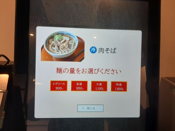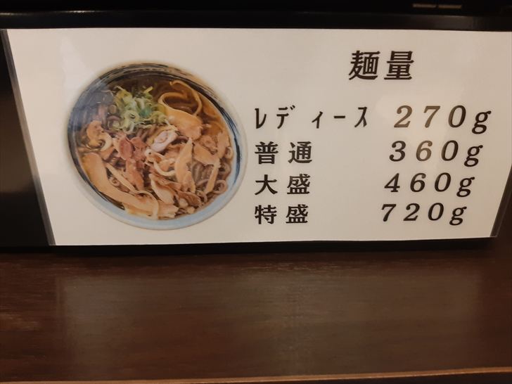 当然のように冷たい肉そばにしましたが、麺量は4種類から選択できるようになっています。普通盛で360gは多めですね。女性向けに麺量270gのレディース盛があるのは良いですね。