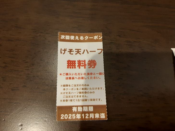 次回使える「げそ天ハーフ」無料券を頂きました。