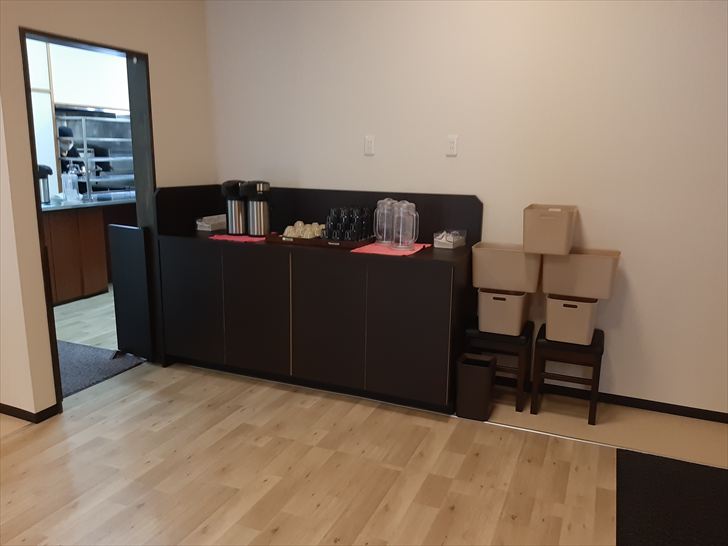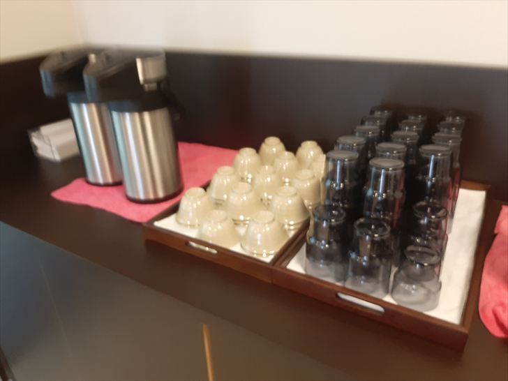 店奥にお冷と温かいお茶があり、セルフサービスになっています。